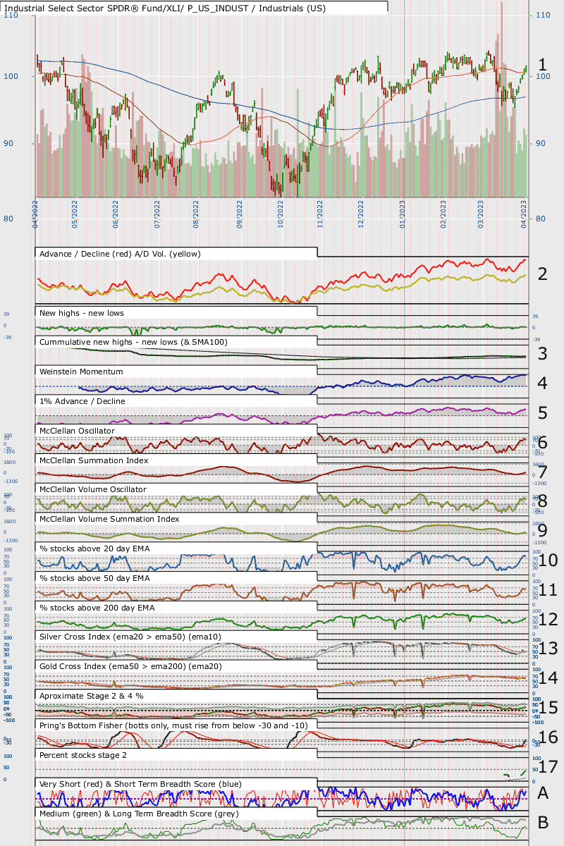 You can clearly argue higher highs and higher lows looking at June, August, September/October, December and March. A longer timescale or 2 years (not shown) makes the 'price' [1] look more like the end point of a longer period of Stage 3 volatility.  If we take August and December as highs then the Advance Decline line [2, red] is diverging negatively, but the Advancing / Declining Volume line [2, yellow] is not.  % stocks about the 20, 50 and 200 day EMA are increasing.  I think that we are seeing the increase in strength as there is the climb out of a low in a volatile sector - but would not like to say much more.