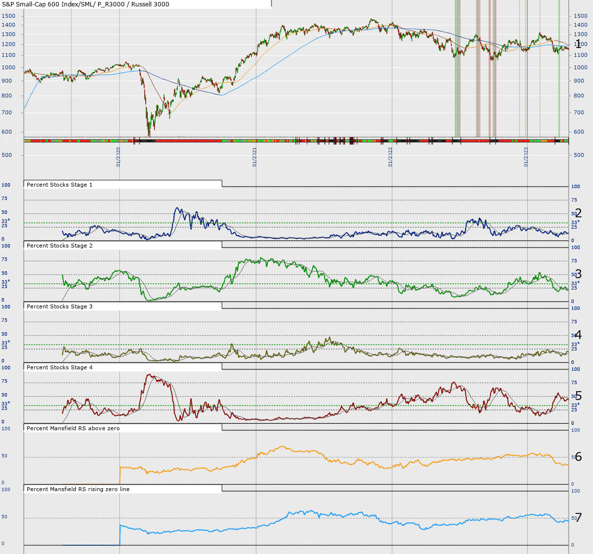 I've got a plot of the S&P Small Cap 600 against my stage and Mansfield RS plots below. That was a good call. Significant point, the % stocks with their RS above the zero line (orange) hits its peak just as the S&P600 stops rising. So the while the S&P600 is on a plateau the orange line is descending as are the number of Stage 2 stocks, Stage 3 starts to grow. The S&P600 goes into Stage 4 a bit after after the % stocks with a RS zero line rising (lighter blue) crosses down through the 50% level.