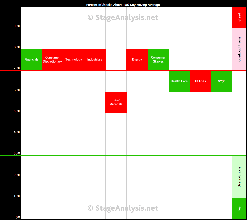 Below is the data table for the Percent of Stocks Above 150 Day Moving Average in each sector which I've ordered by relative strength, with the highest to the lowest percentage in each sector. Also attached is the visual diagram of the 9 sectors and the NYSE Percentage of Stocks above their 150 day Moving Averages line chart.