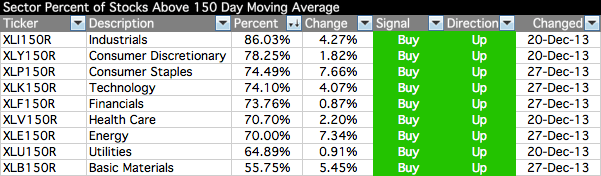 Below is the data table for the Percent of Stocks Above 150 Day Moving Average in each sector which I've ordered by relative strength, with the highest to the lowest percentage in each sector. Also attached is the visual diagram of the 9 sectors and the NYSE Percentage of Stocks above their 150 day Moving Averages line chart.