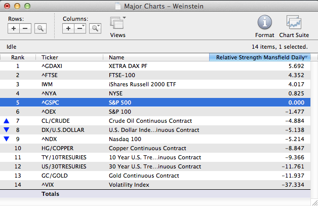 Attached is the updated major equity index charts and the relative performance table for the major charts. It was a quiet week with the Crude Oil the only notable move in the relative performance table, moving up two places after continuing it's rebound from support.