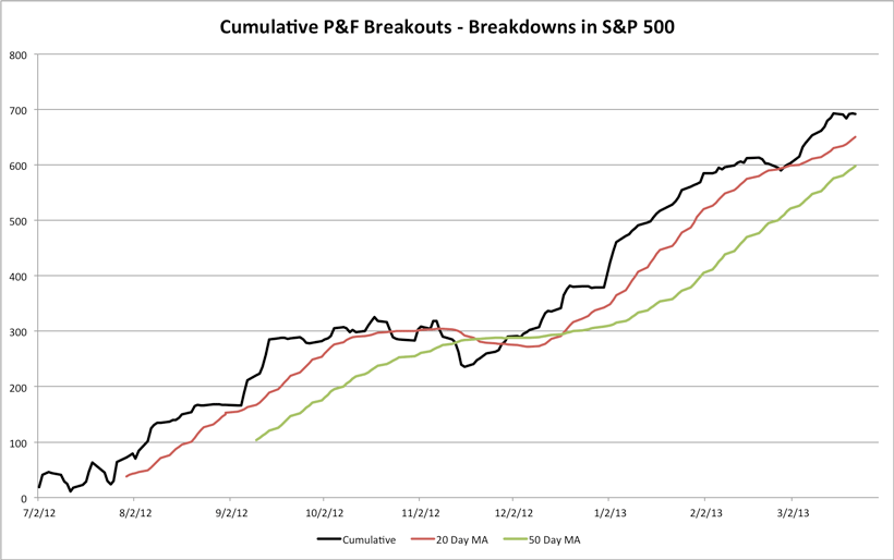 The breakdowns slightly beat the breakouts for a change with 16 breakouts and 17 breakdowns this week in the S&P 500, giving a flat profile for this weeks action on the cumulative chart. The oscillator chart, which shows the same cumulative data, but in a flattened format relative to the 20 day MA, tells a slightly different story, as it looks to have put in a lower high relative to the 20 day MA, which I'm using as the signal line. So although it's above the 20 day MA still, I'm moving my rating for this one to a neutral bear alert status, due to the divergence and loss of momentum in the breakouts. Attached is the charts.