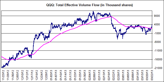 Attached is the updated Effective Volume charts from http://www.effectivevolume.com of the SPY, QQQ and IWM ETFs. It was a fairly flat week for the effective volume until Friday near the close which saw a spike higher in the SPY and QQQ volumes, and so although in neutral territory imo, I'll be watching to see if they can breakout once more next week, or whether the divergences that I can see will lead to a breakdown instead.