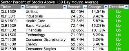 Below is the data table for the Percent of Stocks Above 150 Day Moving Average in each sector which I've ordered by relative strength, with the highest to the lowest percentage in each sector. Also attached is the visual diagram of the 9 sectors and the NYSE Percentage of Stocks above their 150 day Moving Averages line chart.