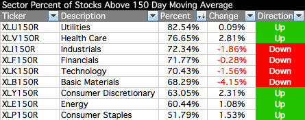 Fate does not always let you fix the tuition fee. She delivers the educational wallop and presents her own bill - Reminiscences of a Stock Operator. US Industry Sectors BreadthBelow is the data table for the Percent of Stocks Above 150 Day Moving Average in each sector which I've ordered by relative strength, with the highest to the lowest percentage in each sector. Also attached is the visual diagram of the 9 sectors and the NYSE Percentage of Stocks above their 150 day Moving Averages line chart.