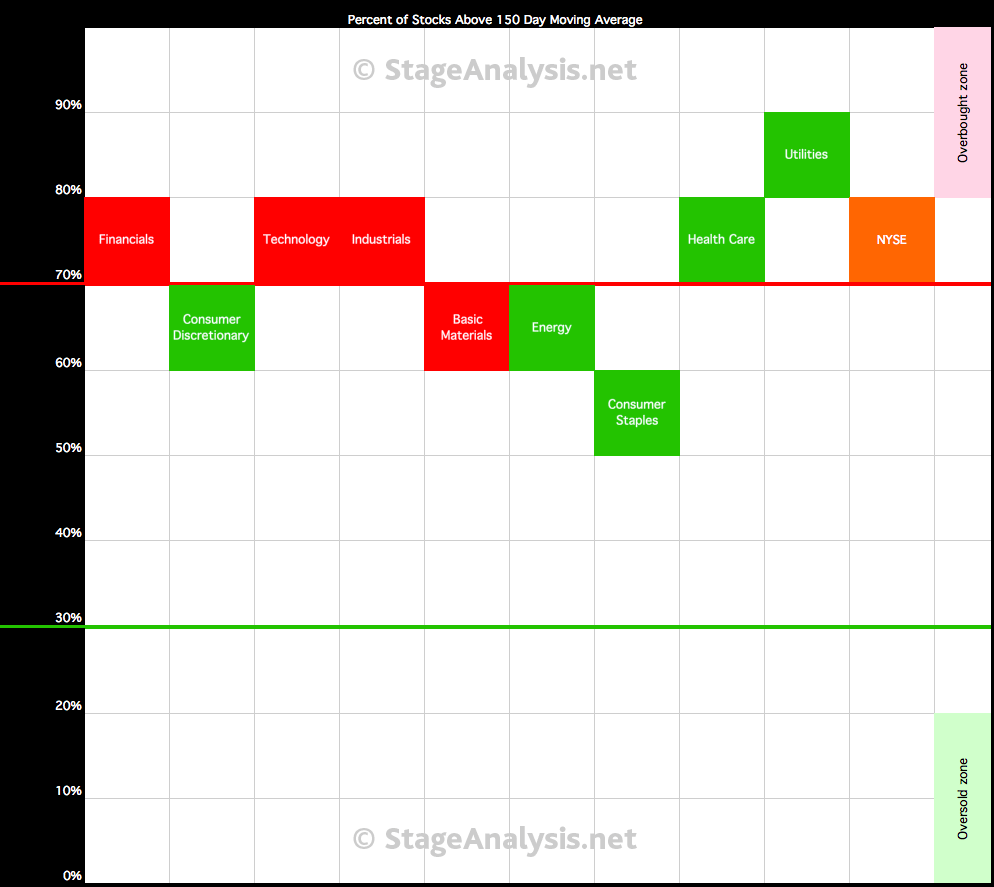 Below is the data table for the Percent of Stocks Above 150 Day Moving Average in each sector which I've ordered by relative strength, with the highest to the lowest percentage in each sector. Also attached is the visual diagram of the 9 sectors and the NYSE Percentage of Stocks above their 150 day Moving Averages line chart.