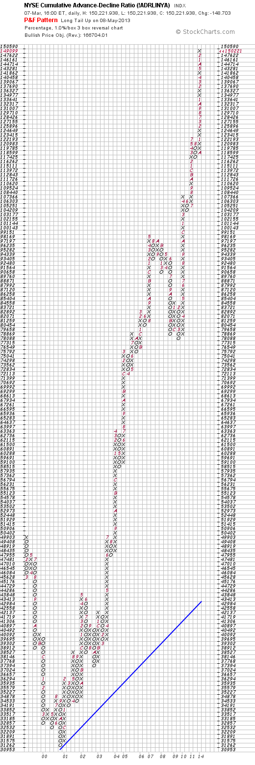 From now on I'll also be including the Cumulative Advance Decline P&F chart, and will occasionally show different box sizes and the percentage charts, which give more context. This week I'm including the traditional scale P&F chart, the 0.5% chart, and the 1% chart which gives long term signals.