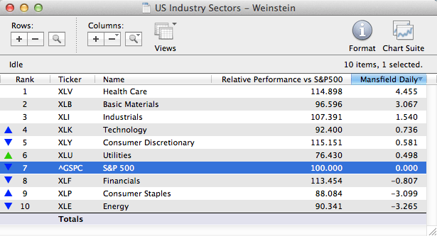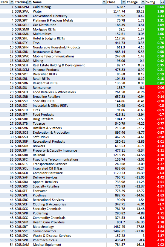 Attached is the US Sub Sectors ordered by the weekly percentage change. To see the full list sectioned by major sector, with links through to individual stocks in each sector, go to: http://stockcharts.com/freecharts/indust...ECTOR_SPDR