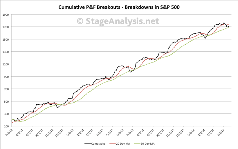 Attached is the exclusive S&P 500 Cumulative P&F Breakouts - Breakdowns charts.