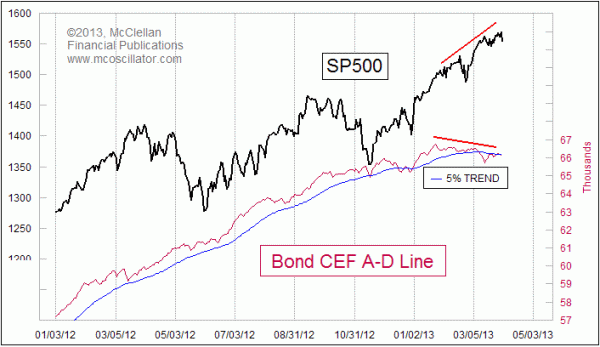 I take the opposite view. If anything, the bond CEFs improve the composite A-D data by virtue of their presence. The reason for this is that the main virtue of A-D data is as an indicator of market liquidity. It is possible to push the major large-cap indices higher during an illiquid period if the limited liquidity is channeled into the "right" stocks. But to get the large majority of stocks to go up, there needs to be such prolific liquidity that there is enough to go around for everybody.