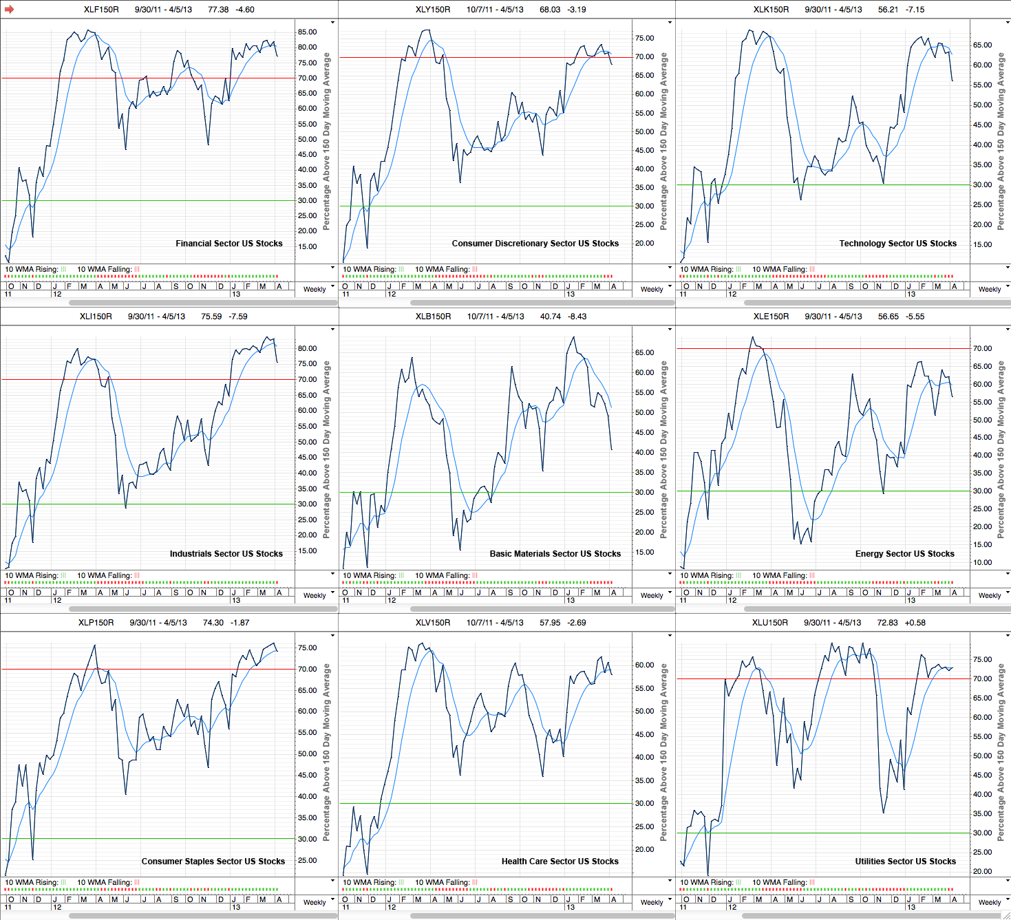 Below is the data table for the Percent of Stocks Above 150 Day Moving Average in each sector which I've ordered by relative strength, with the highest to the lowest percentage in each sector. Also attached is the visual diagram of the 9 sectors and the overall NYSE Percentage of Stocks above their 150 day Moving Averages, plus the 1% P&F chart and line chart of the nine sectors.