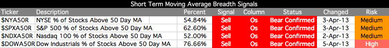 The short term moving average breadth charts continue to be where the noticeable action is currently, with all four moving to Bear Confirmed status during the week. The medium to longer term charts also dropped, but didn't made any status changes.