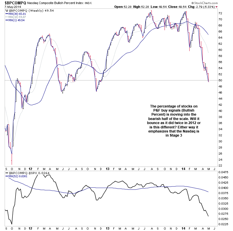 The divergence between the NYSE and the Nasdaq has continued over the last month, with the Moving Averages Breadth charts all on Bear Confirmed status in the lower half of the scale and today some of the other breadth gauges have joined them with the Nasdaq Cumulative Advance Decline Line breaking down, the Nasdaq Momentum Index rapidly approaching it's zero line, and the Nasdaq Bullish Percent Index closing the day in the bearish half of the scale below 50 for the first time since 2012. So although there are numerous signs on the short term gauges that it's oversold, the medium and longer term measures still have a long way to go before they get to oversold levels, and hence with the Nasdaq Composite chart itself still yet to breakdown, my conclusion is that it's in late Stage 3B and the signs from the breadth indicators suggest that it hasn't got many more dead cat bounces left before it moves into a full Stage 4 decline.