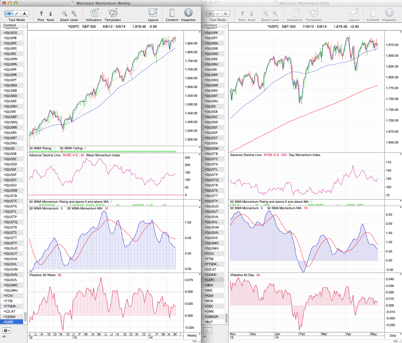 For more idea of the major breadth indicators he uses reread chapter 8 in the book, which talks about the advance decline line, momentum index, new highs new lows etc.