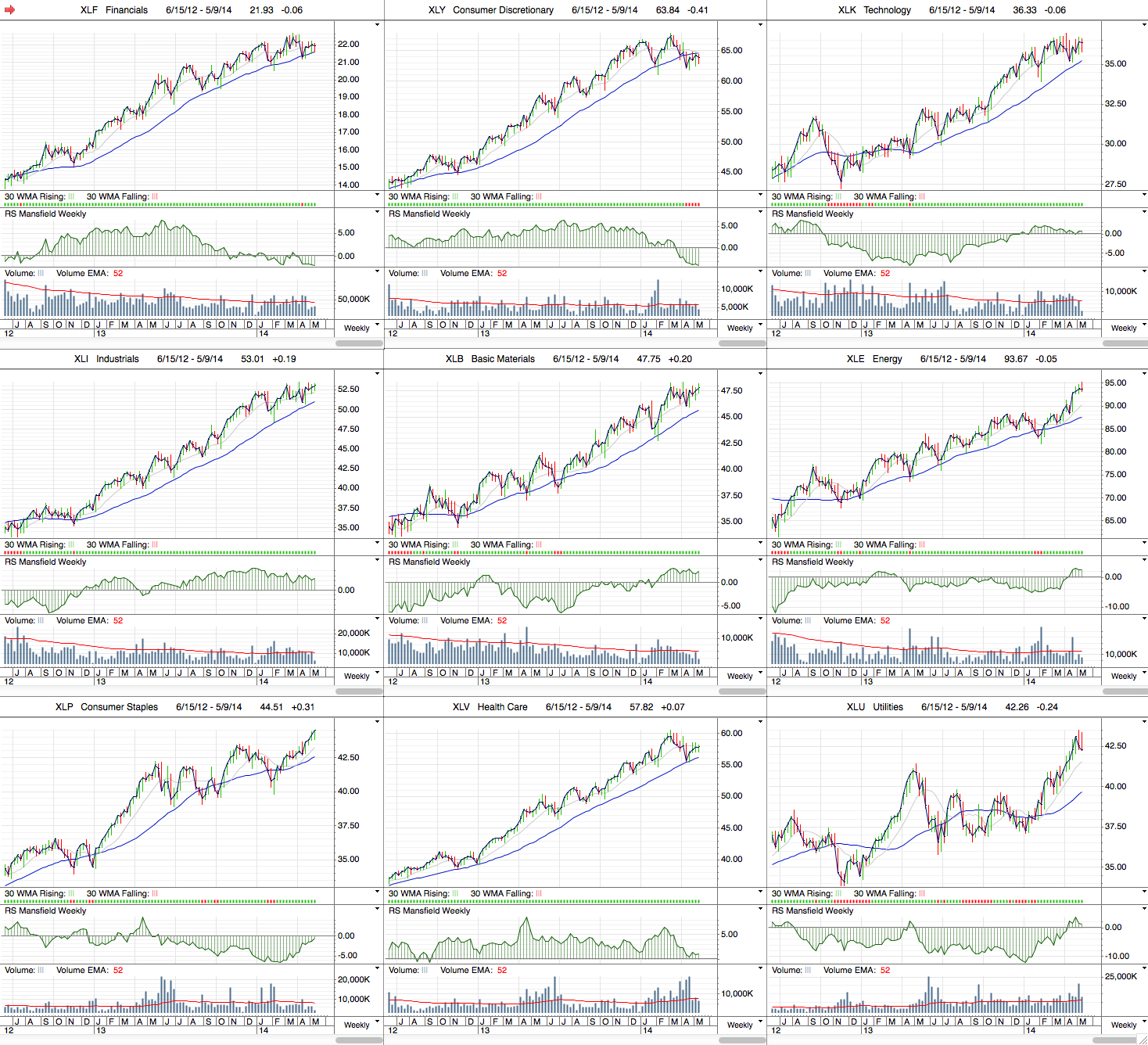 (2014-05-10, 03:53 PM)Tryst Wrote: looking at the sectors chart of percentages of stocks above the 150 day MAs, with 7 out of the 9 being underneath 70% (the two sectors above being the defensive sectors, energy and utilities), would you assume the likelyhood is that the NYSE will follow the NASDAQ lower?