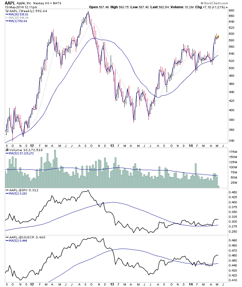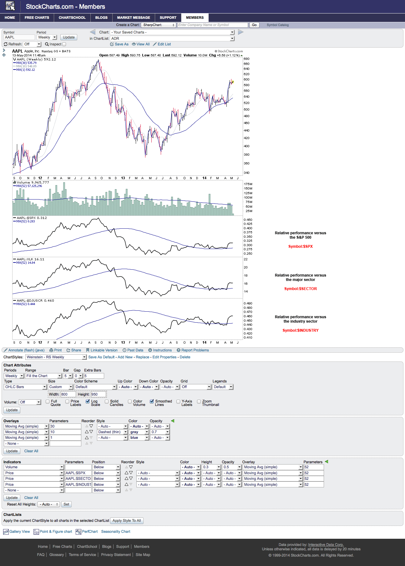 Attached is the normal weekly chart I use with the additional sector relative performance indicators added, so that you can see the settings needed to create them on stockcharts.