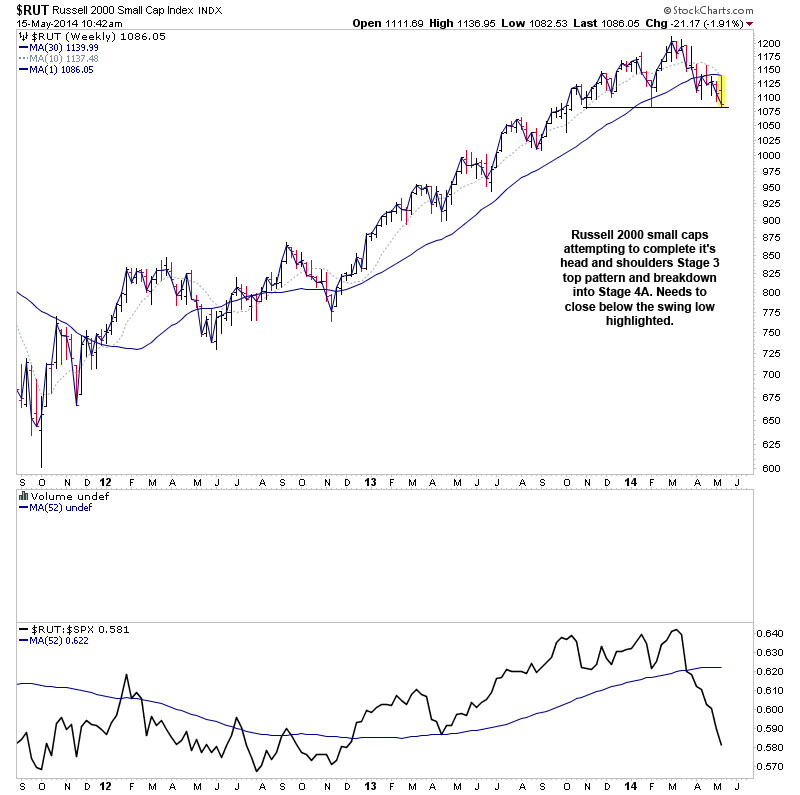 Russell 2000 small caps ($RUT) attempting to complete it's head and shoulders Stage 3 top pattern and breakdown into Stage 4A. Needs to close below the swing low highlighted, and then finish the week below it for confirmation of the Stage change.