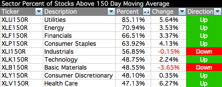 Fate does not always let you fix the tuition fee. She delivers the educational wallop and presents her own bill - Reminiscences of a Stock Operator. US Industry Sectors BreadthBelow is the data table for the Percent of Stocks Above 150 Day Moving Average in each sector which I've ordered by relative strength, with the highest to the lowest percentage in each sector. Also attached is the visual diagram of the 9 sectors and the NYSE Percentage of Stocks above their 150 day Moving Averages line chart.