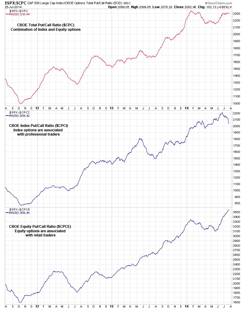 Fate does not always let you fix the tuition fee. She delivers the educational wallop and presents her own bill - Reminiscences of a Stock Operator. S&P 500 / Index and Equity Options RatioAttached is the updated S&P 500 / Index and Equity Options Ratio charts, which is currently showing a divergence between the index options direction and the equity options direction.