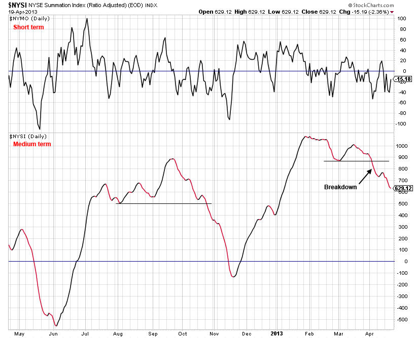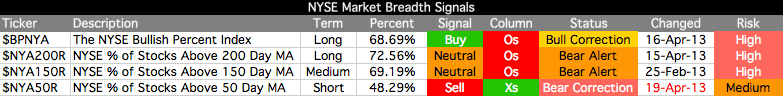 Attached is the NYSE long, medium and short term moving average breadth charts and the NYSE Bullish Percent Index.