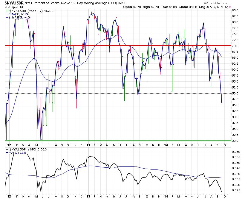 NYSE Percentage of Stocks above their 200 Day and 150 Day Moving Averages charts are at their lowest levels in two years with the 150 day moving below the key 50% level, and the Nasdaq charts continue to be weak as well, both below 40% and so more than half the US stocks are currently in Stages 3 and 4.