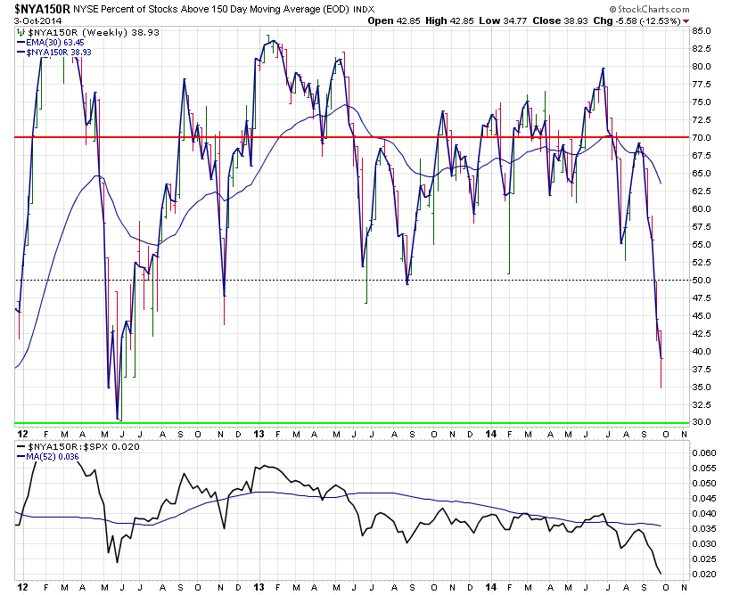 Small caps are in Stage 3 and the breadth is weak but in the oversold zone short term, and so possible technical bounce began at the end of the week, but the breadth weakness is warning that if the bounce fades and can't make a new high or close back above the 200 day MA, then a Stage 4A breakdown attempt could be possible in the coming week/s in the small caps.
