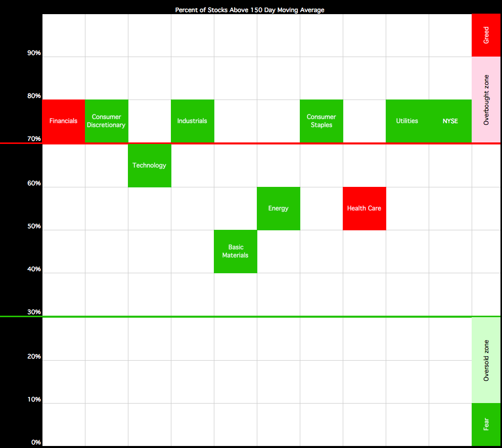 Below is the data table for the Percent of Stocks Above 150 Day Moving Average in each sector which I've ordered by relative strength, with the highest to the lowest percentage in each sector. Also attached is the visual diagram of the 9 sectors and the overall NYSE Percentage of Stocks above their 150 day Moving Averages, plus the 1% P&F chart and line chart of the nine sectors.