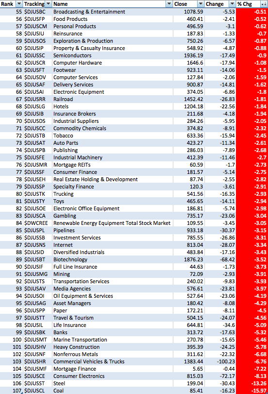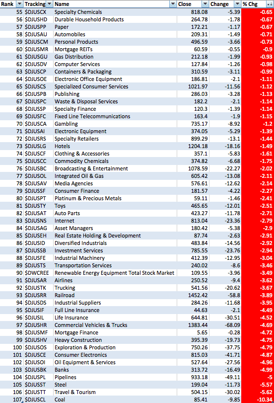 Fate does not always let you fix the tuition fee. She delivers the educational wallop and presents her own bill - Reminiscences of a Stock Operator. Dow Jones US Sub Sectors PerformanceAttached is the US Sub Sectors ordered by the weekly and monthly percentage change.