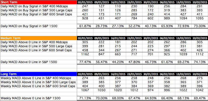 The long term measure is the % stocks with a Weekly MACD Line above the Zero Line in the S&P 1500.