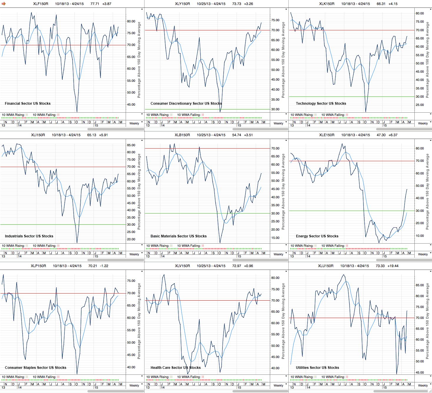 Note: We currently have 7 of the 9 sectors in the Bull range, with the other two sectors recovering further into the Neutral ranges. The overall average of the sectors is 66.83%, which if you compare to the beginning year it was 54.84% - and so the US market has been strengthening in 2015 so far by this breadth measure.