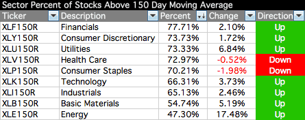 Below is the Percent of Stocks Above their 150 Day Moving Average in each sector. Also attached is the visual diagram of the 9 sectors and the two major exchanges that make up the sectors that shows a snapshot of the overall health of the US market and the data table of the sectors which is ordered by overall health.