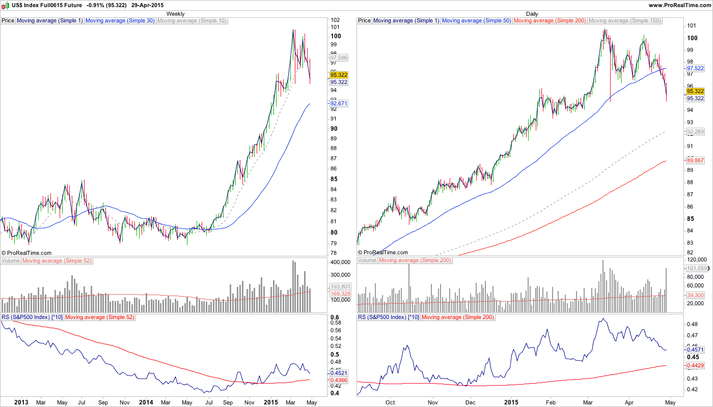 Note: the dollar momentum has broken down and it's now trading below the 10 week MA significantly. Hence it could pullback further even if it remains in Stage 2 which could benefit commodities that largely have a negative correlation to the dollar, especially oil which has had a very close negative correlation through it's entire Stage 4 decline.