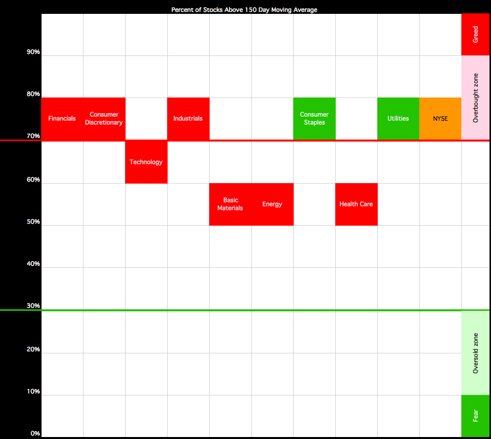 Below is the data table for the Percent of Stocks Above 150 Day Moving Average in each sector which I've ordered by relative strength, with the highest to the lowest percentage in each sector. Also attached is the visual diagram of the 9 sectors and the overall NYSE Percentage of Stocks above their 150 day Moving Averages, plus the 1% P&F chart and line chart of the nine sectors.