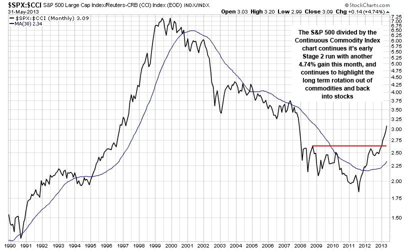 The S&P 500 divided by the Continuous Commodity Index chart continues it’s early Stage 2 run with another 4.74% gain this month, and continues to highlight the long term rotation out of commodities and back into stocks.