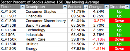 Below is the Percent of Stocks Above their 150 Day Moving Average in each sector. Also attached is the visual diagram of the 9 sectors and the two major exchanges that make up the sectors that shows a snapshot of the overall health of the US market and the data table of the sectors which is ordered by overall health.