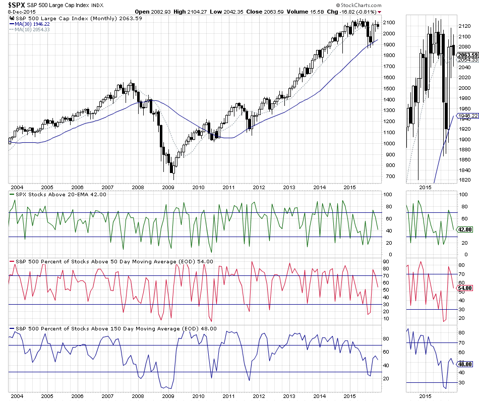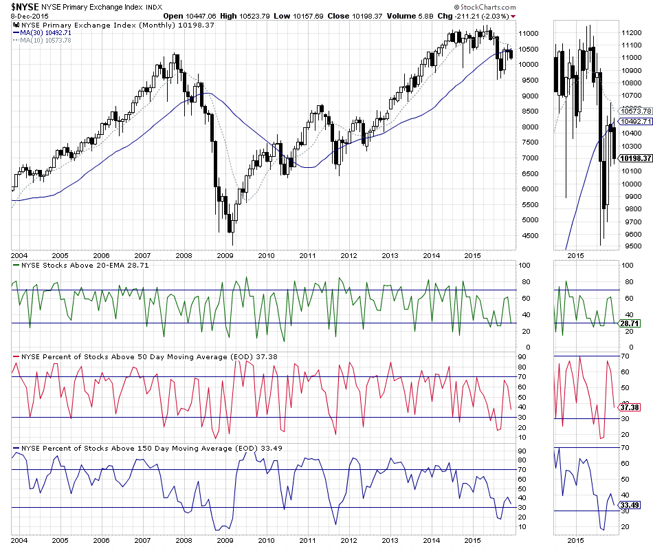 Interesting. The peak in the % above the 200 day MA peaked in May/June 2013 when looking over a 5 year time frame. You could argume that there has been a weakening therefore since then. However, mid 2015 is when it has started to drop more rapidly and had the volatile dip.