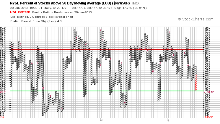 The short term NYSE Percentage of Stocks above their 50 day Moving Averages chart ($NYA50R) gave another double bottom breakdown and so moves once again back to Bear Confirmed status. But note that it's now moving into the lower range of the chart.