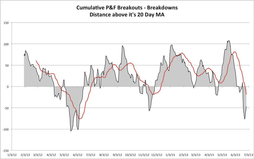 I've also included and extra chart which shows the straight P&F Breakouts minus Breakdowns 20 day moving average on it's own to make it clearer, as it's hard to see on the normal chart. Currently, it's in bearish territory below the November 2012 low and the zero line.