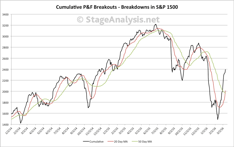 S&P 1500 Cumulative P&F Breakouts - Breakdowns charts