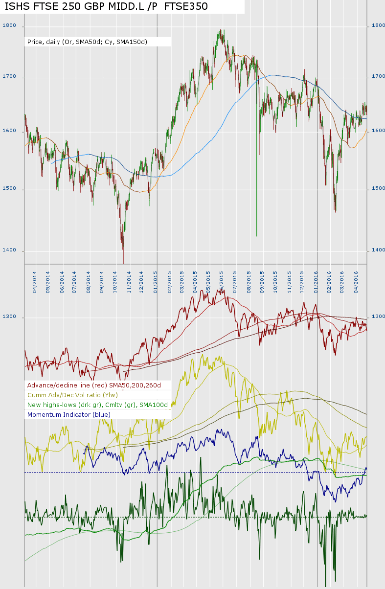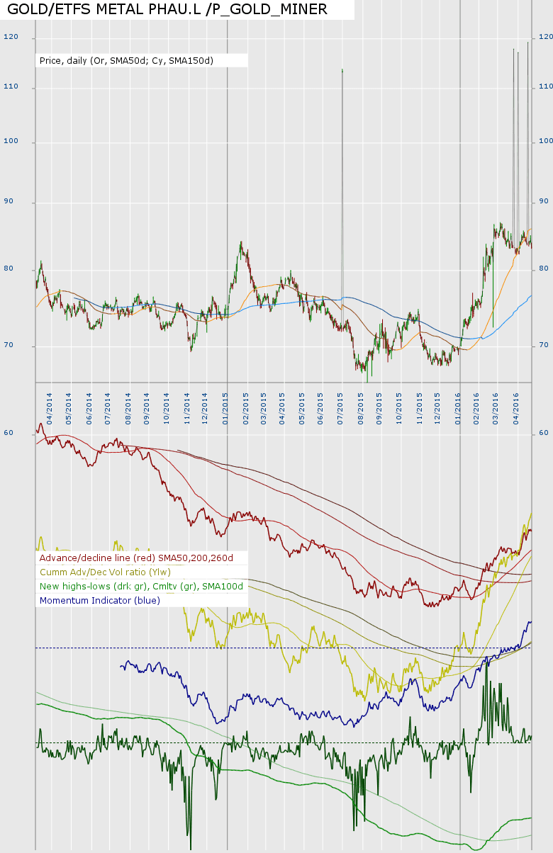 RE: Stan Weinstein's Stage Analysis(2016-05-07, 01:34 PM)isatrader Wrote: Here's the quick overview charts of the US Bullish Percent and Moving Average Breadth. My view, from plotting US sector ETFs against the Wilshire 5000 or each other is that Utilities, Consumer Staples, Energy and Materials are the strongest sectors. I've calculated breadth charts based mainly on their consituents. Usual caveats, breadth calculated from a very small pool of stocks and I have made errors previously. I've not seen these appear in my screener as prominently as the gold miners yet. I note that SPOG.L (oil & gas producers) seems to be coming out stage 4 and forming a base perhaps. However, I'm nervous if crude has not done the same, at the moment CRUD.L is just below its MA150d but it is flattening. Too early to say yet? |