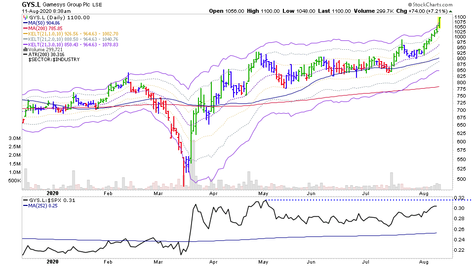 GYS.L is breaking above the IPO-AP high level today, and moving to new all time highs in its Stage 2 advance that began in April. It'sĀ outside of the normal 3ATR Keltner channel range currently, so I'm looking for the next consolidation base to form.