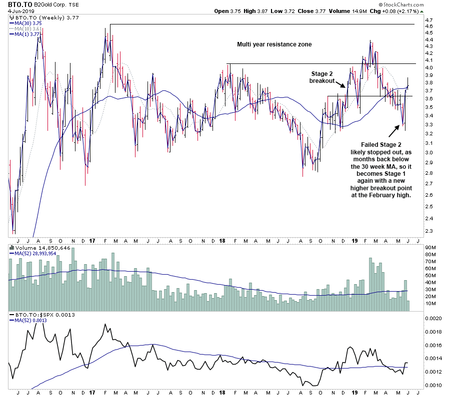 Fate does not always let you fix the tuition fee. She delivers the educational wallop and presents her own bill - Reminiscences of a Stock Operator. RE: UK Stocks and ETFs - Watchlist and Discussion(2019-06-05, 07:47 AM)isatrader Wrote: Gold priced in Canadian dollars might be breaking out. But from looking at the charts, YRI.TO is in Stage 4 and BTO.TO is in Stage 1, so I'm not sure why you think they are such good charts, when there is a lot of others in the sector in better positions? Check your charts against the requirements in the Stage Analysis Breakout Quality Checklist thread, as that will help you. Hi isa, I've looked at your checklist, and their Ichimoku cloud does not look good yet (what other requirements do they not meet?). I've picked the 2 stocks I mentioned because they recently crossed the MA(30) and the Mansfield Relative Strength is above 0. BTO seems to have crossed a resistance last week, the last time it crossed that same resistance is back in Dec2018 and it went above 4.30 after that. Also, BTO reported strong Q1 results. I also looked at the following gold stocks: IMG.TO WDO.TO ASR.TO COP.TO Which ones do you suggest are in better positions in the TSX? Thanks in advance. RE: UK Stocks and ETFs - Watchlist and DiscussionOther than being just above the 30 week it's 14% below it's February high. The 10 week MA is below the 30 week MA. We can't assess the volume until it makes a new breakout attempt above the recent high, as the volume requirement is for the Stage 2 breakout week and after. Relative performance might be above the zero line, but as with price it's below the recent highs. See the marked up chart on the previous page.