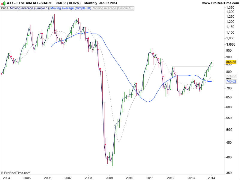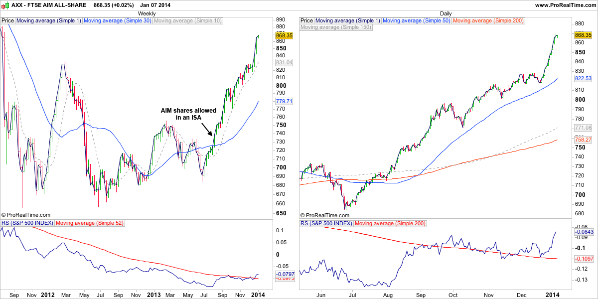 An index chart that hasn't been shown before on the site is the FTSE AIM All Share index - AXX, but I thought it would be interesting as it shows that UK micro caps in the AIM market have been outperforming since the late summer when they broke out into Stage 2A, and over the last few weeks cleared the early 2012 highs and broke above the relative performance zero line versus the S&P 500 and so are also outperforming the US market now as well as strongly outperforming the FTSE 100. And hence UK investors and traders should be looking in the AIM market for Stage 2 opportunities as the AIM is now in a confirmed Stage 2 advancing phase after a few years of recovery from the Stage 4 downturn in the summer of 2011.