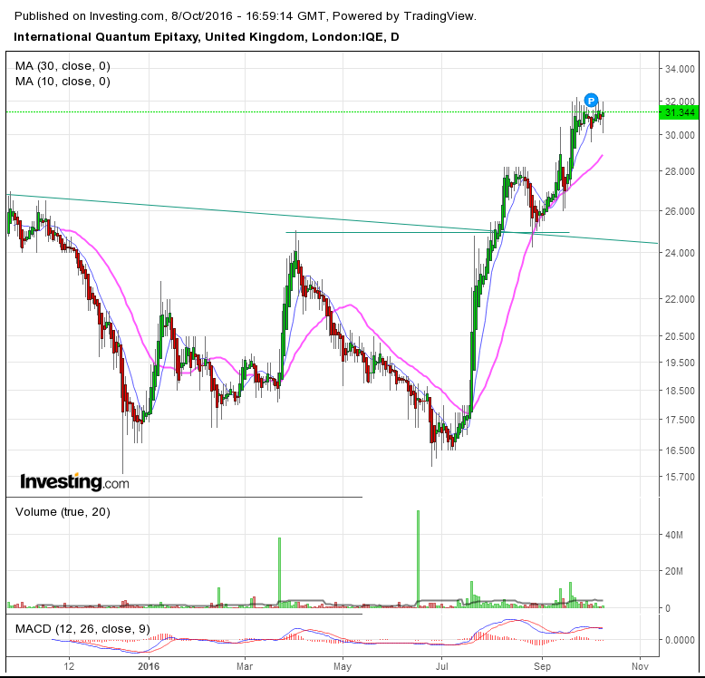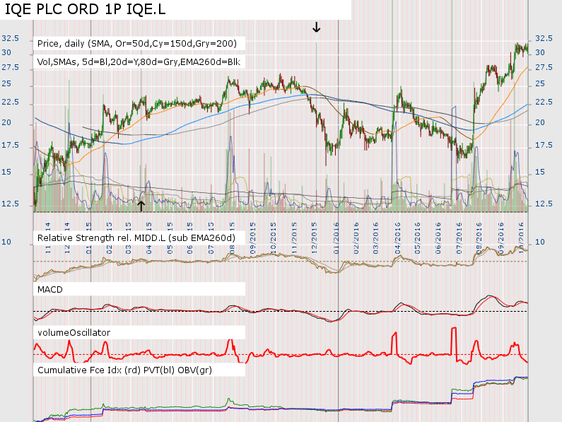 (2016-10-08, 05:57 PM)Smellypunks Wrote: Yep that is what I am thinking. I quite like the look of IQE if we are talking technology, it has broken out on good volume, it is trying to get through 2 year old resistance.