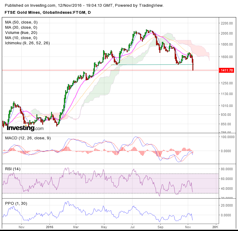 (2016-11-12, 08:06 PM)Smellypunks Wrote: Gold miners have broken a support level this week. But it should also be noted that gold miners are the most oversold they have been since the start of the year.