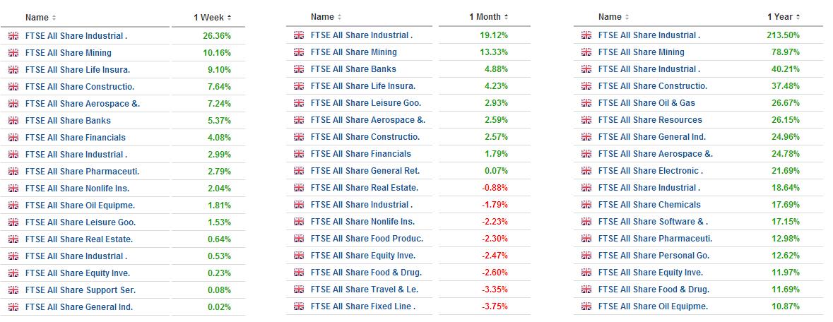 FTSE sector performance for 1, week, month, year.