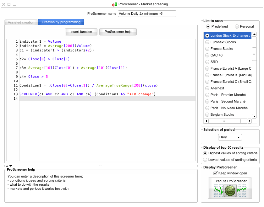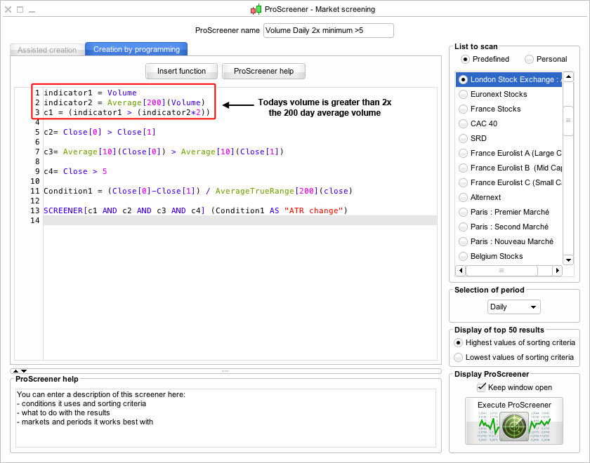So if you want to do a scan on the weekly chart then change the Selection of period drop down menu to Weekly and adjust the volume and ATR settings to 52 and save as a separate scan. As I said it's fairly straight forward, so you'll get the hang of it quickly.
