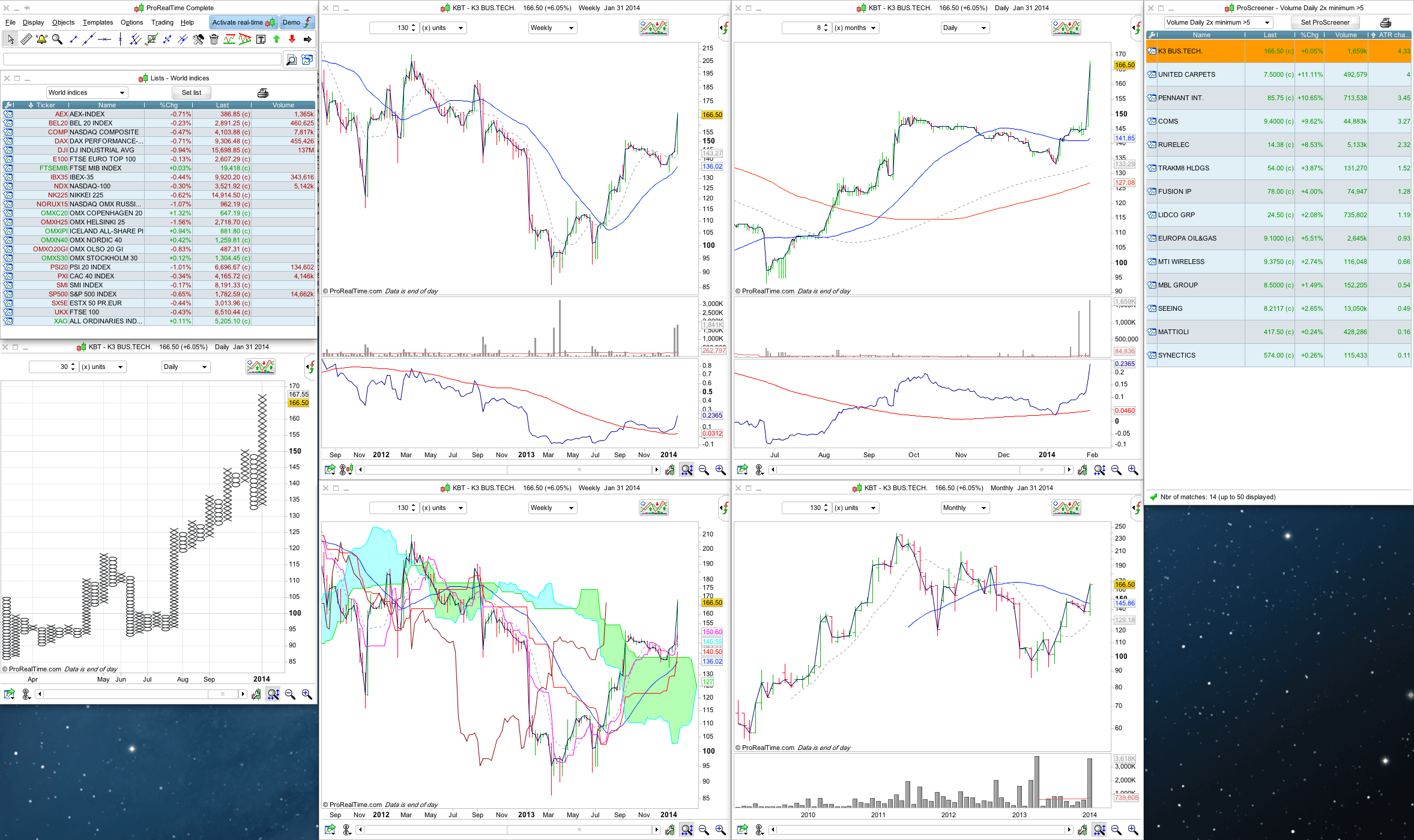 Also, I've attached my scanning screen setup, as I find looking at multiple time frames, resistance and point and figure on the same screen really helps when going through the results. I look at the weekly chart first, and have two versions on the same screen - one clean and one with ichimoku for support and resistance. Then the daily and monthly charts on the right, and a 1% P&F chart on the left. I have 27" screen though, so it wouldn't be possible on a smaller screen to have it all open, although I know some people have two small screens etc.