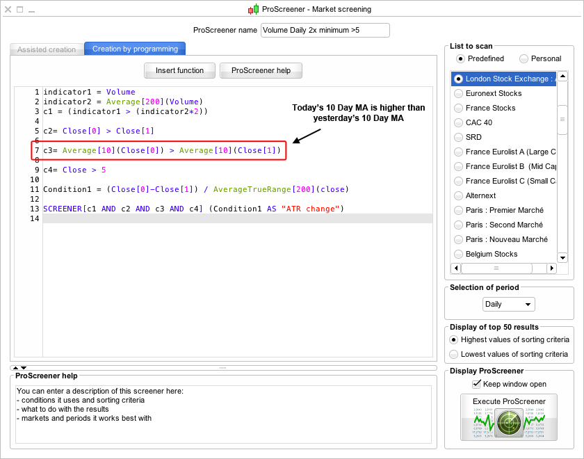 This is the moving average. So I'm asking the screener to find a stock that's 10 day moving average is higher than yesterday's 10 day moving average. i.e the 10 day MA is rising.