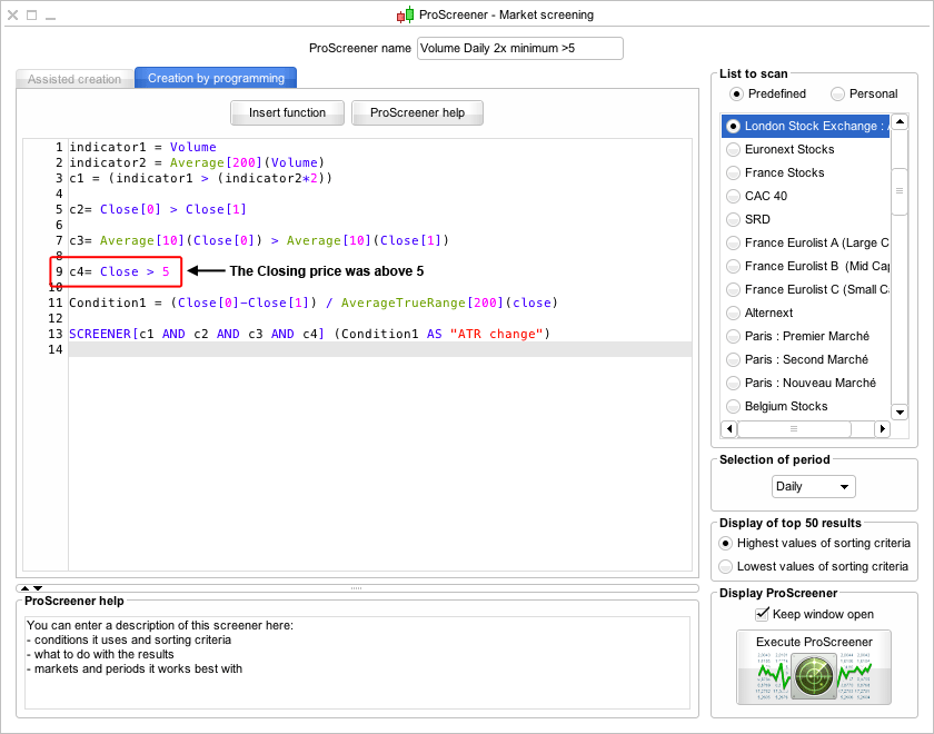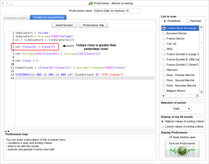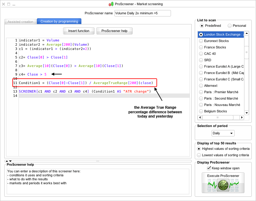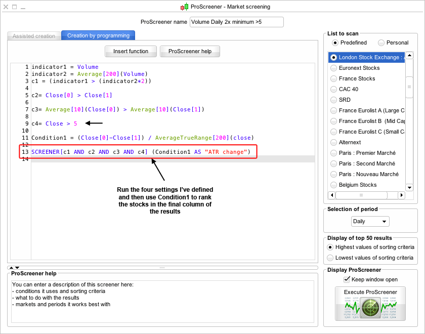 Condition1 = (Close[0]-Close[1]) / AverageTrueRange[200](close) is to determine which stocks get shown, as by default it will just give you the highest percentage gainers, which is no good. As as we know, we want to find the stocks that have made the biggest percentage moves relative to normal trading range. So we use the Average True Range instead to rank them, as also the scanner can only show 50 stocks, so the ATR will stop you getting all penny stocks.